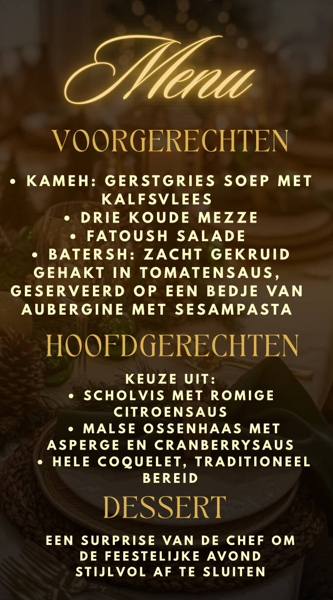 Of je nu langskomt voor een gezellige avond in ons restaurant, een tafel reserveert voor een speciaal moment, of onze gerechten mee naar huis neemt. Bij ons proef je altijd de authentieke Midden-Oosterse beleving.